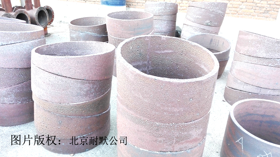 結構形式:在普通碳鋼管內襯碳化硅陶瓷,形成碳化硅/鋼復合管。內襯碳化硅采用不等厚偏心圓結構型式,即彎管外側、直管下半部稍厚,以使管道各部位耐磨壽命相同,減少浪費。碳化硅外側采用玻璃鋼包裹,以提高整體強度水平。過渡段根據用戶要求可采用普通碳鋼管也可采用氧氣鋁復合耐磨鋼管,或采用法蘭盤連接。可作成直管或蝦米腰式彎管。